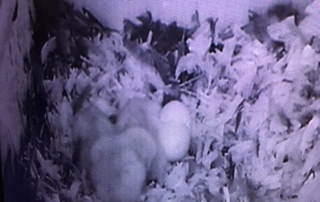 The first owlet hatched on Monday, April 12, one month from the day the first egg was laid. Two more owlets appeared the next day, leaving two eggs unhatched. On Wednesday, April 14, two eggs were still unhatched with three owlets. Last night only one egg remained, so four have hatched.