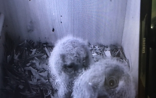 The owlets are getting ready to fledge. They jump around the box, stretching their fuzzy gray bodies up to the box ceiling, spreading their wings, flapping them. They dig in the sawdust, scratching away, searching for tidbits.