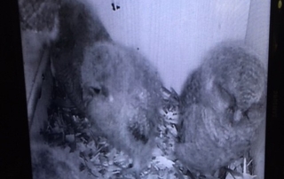 The fifth egg hatched on or about April 17 when we noticed the last egg missing, but weren’t sure if the egg had hatched or been eaten. The owlets huddle together in one big fuzzy ball, so it’s hard to tell how many owlets are there, but by Monday the fifth owlet could be seen in the middle of its four siblings, its tiny white head and skinny wings and body sticking out.