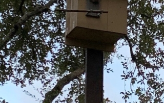 The owl huddles in the corner of the box. He perches in the entrance in late afternoon or the middle of the day if it’s warm. The past few days he has left the box at somewhere between 6:30 and 6:45 p.m.; shooting out of the box and swooping down, he flies over the fence toward the greenbelt. A couple of days passed when he wasn’t in the box, but they were only isolated episodes.