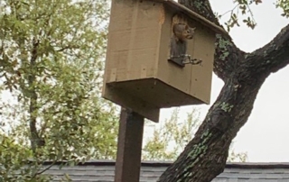 A squirrel invaded our owl box in early January. When we didn’t see the owl for a few days at the end of December, we wondered if he had left the box for a few days, as is normal screech owl behavior. And then a squirrel popped its little head out of the box opening.