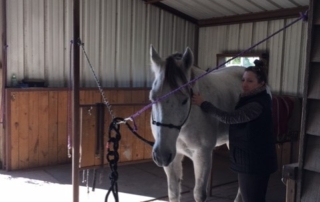 Willis was treated to a myofascial release session yesterday from Chase of Cadence Therapy. It is deep work, but at the same time light work. Watching, it doesn’t look like Chase is doing much, but Willis obviously feels something judging from his licking, chewing on his crossties and lead rope, turning his head sharply to the side to watch her.