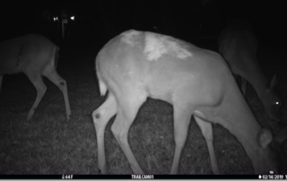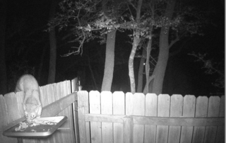 A ringtail visits the backyard almost every night, traveling back and forth along the fence from our neighbors’ yard to ours. We keep a small feeder tray filled with orange peels and dried fruit to entice him and birds, but the menu also appeals to a local possum. One night the trail cam caught both possum and ringtail at a standoff as they chased each other down the fence and out of the yard.