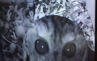 Mm. Owl surprised us on Tuesday by laying a fifth egg. She stayed in the box that evening and, for the first time, we saw Mr. Owl visit the box and feed her.