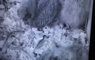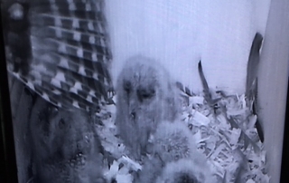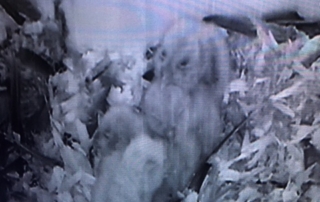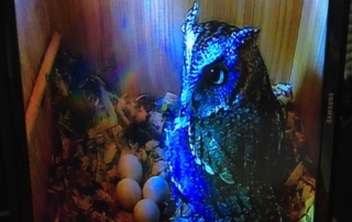 The first owlet hatched yesterday. Last night around 9 p.m., F20 was shuffling the sawdust, spreading her wings and spinning around in the box when tiny chirps could be heard.