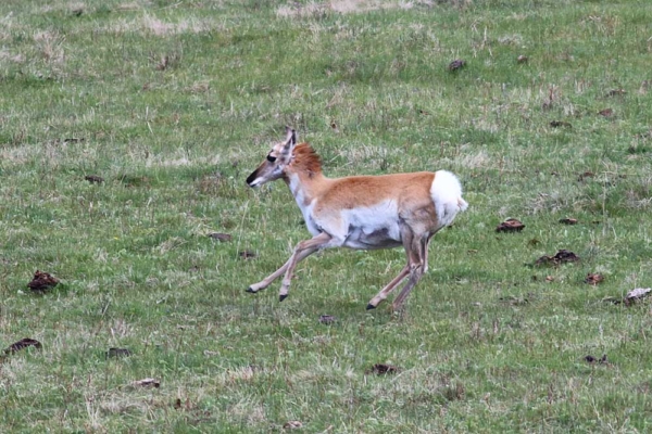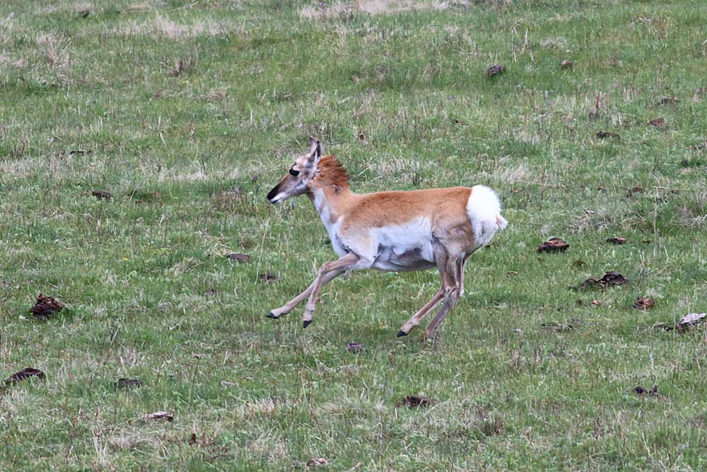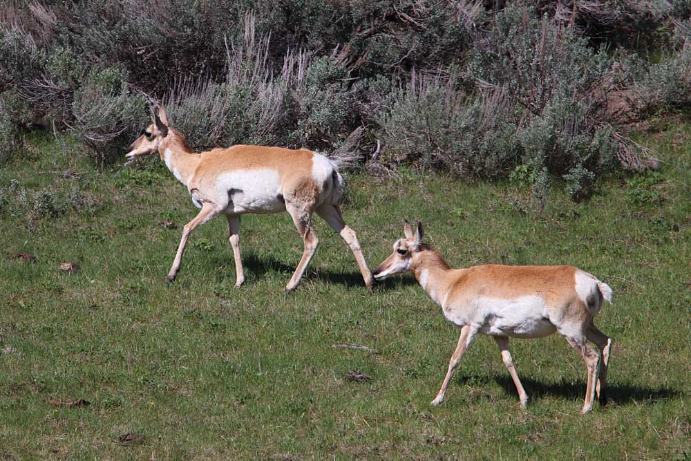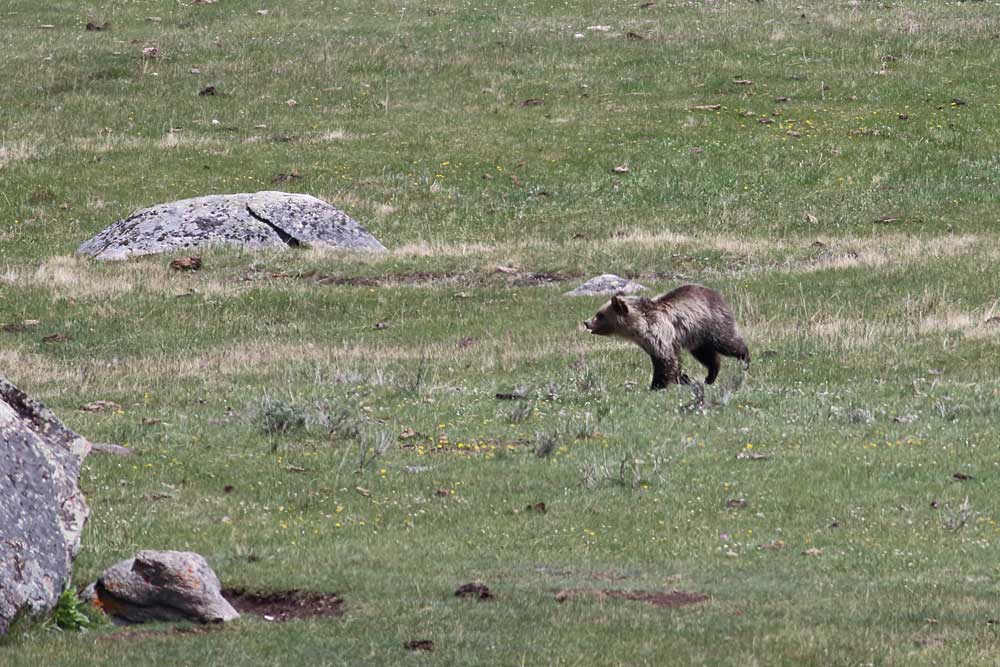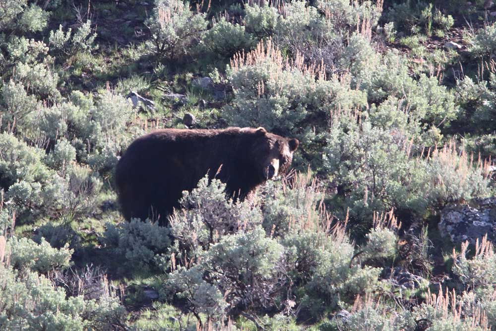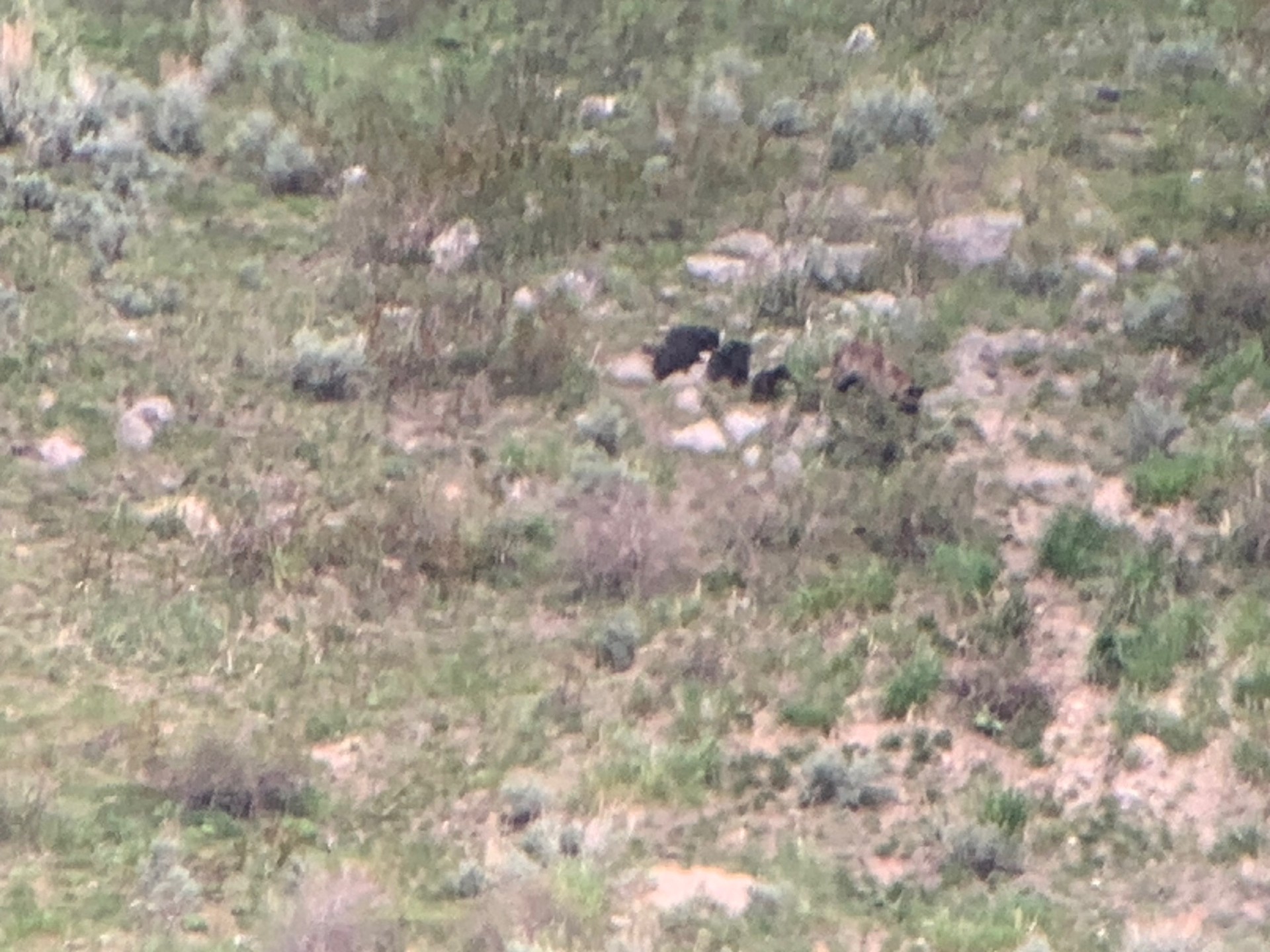 Though it was sunny today, it never got really warm, the temperature staying between 30º-48º. We drove back and forth looking for wildlife. At the Slough Creek den, four black pups tumbled out into the grass and sage while a black wolf, probably 1479F, watched over them. We hiked up Specimen Ridge Trail looking for badgers and stopped to enjoy the view of Little America when a group of pronghorns raced down the slope. Minutes later Tim looked out and spotted a small grizzly running across the slopes. It looked like the two-year-old we saw with the sow and yearling on Saturday when we first drove in. He ran through the sage, crossing the road to the sage flats below Junction Butte.