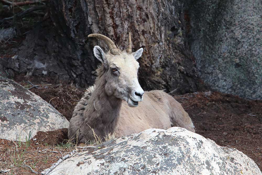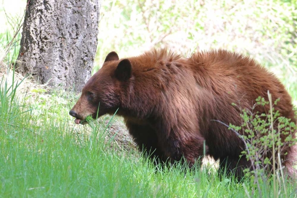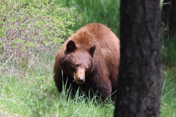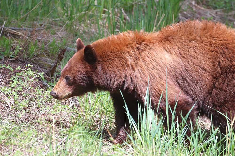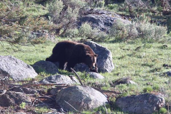 Since Dunraven Pass is still closed, we turned back toward Hellroaring to look for pika. We followed the path around the scree slopes, carefully scanning the rocks and listening for their chirps. Nothing. Disappointed, we were ready to give up when a gentleman told us there was a cinnamon bear just on the other side in the woods. The bear was a beautiful red-brown and healthy looking. He foraged in between the trees, looking up every now and then, completely undisturbed by the small group of people watching him.