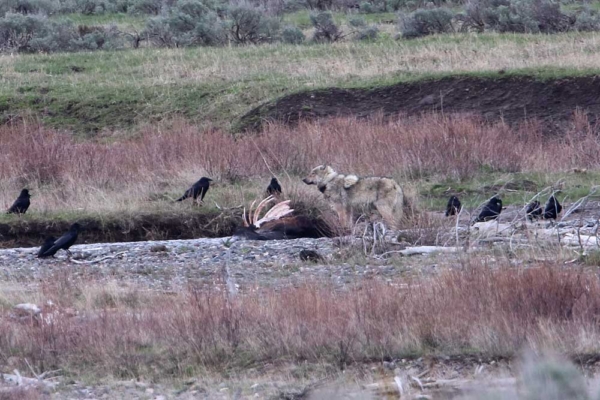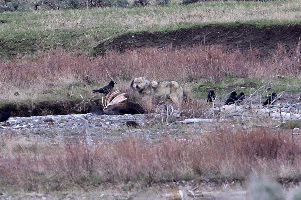 Later this afternoon we took short hikes in Lamar Valley, down from Dorothy’s and to the river. There was a crowd at Round Prairie watching a carcass on Soda Butte Creek where we just missed seeing a wolf and bear. Lucky for us, the wolf reappeared, a large, gray collared wolf who fed on the carcass for a long while. He tore off a piece and bedded in the grass away from the carcass, leaving it to the ravens. Then he made his way back to the trees and into the woods, heading west, probably back to the den.