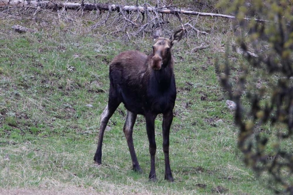 It started to rain lightly as we headed back to Silver Gate. We spotted a yearling moose standing alone in a meadow while a cow moose grazed across the road at Soda Butte picnic area. I wondered if he was one of the yearlings we saw this morning and she was his mother. We turned back and the cow moose crossed the creek and ran across the road.