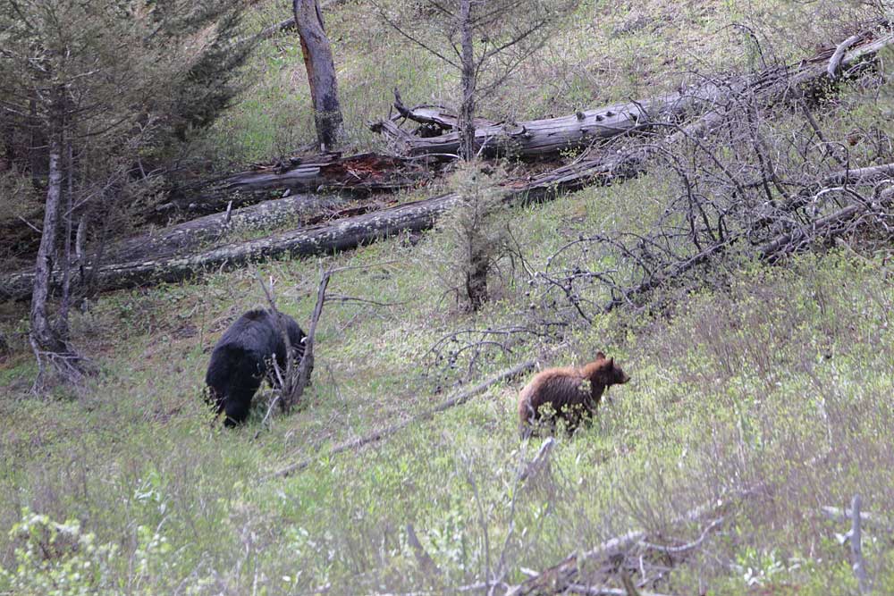 Down the road a grizzly boar climbed down the wooded slopes of Junction Butte. He moved with a determined gate, first to the meadows then back up through the trees and over the top. We continued west to Tower Junction and up the road where a black bear sow and her cinnamon phase yearling cub were foraging in the grass and trees off the road. The little bear is so cute. It’s surprising that we aren’t seeing more black bears and cubs along Tower Road, though I certainly don’t miss the crowds.