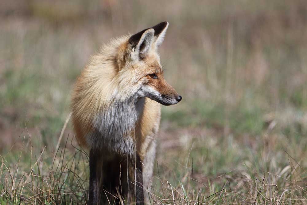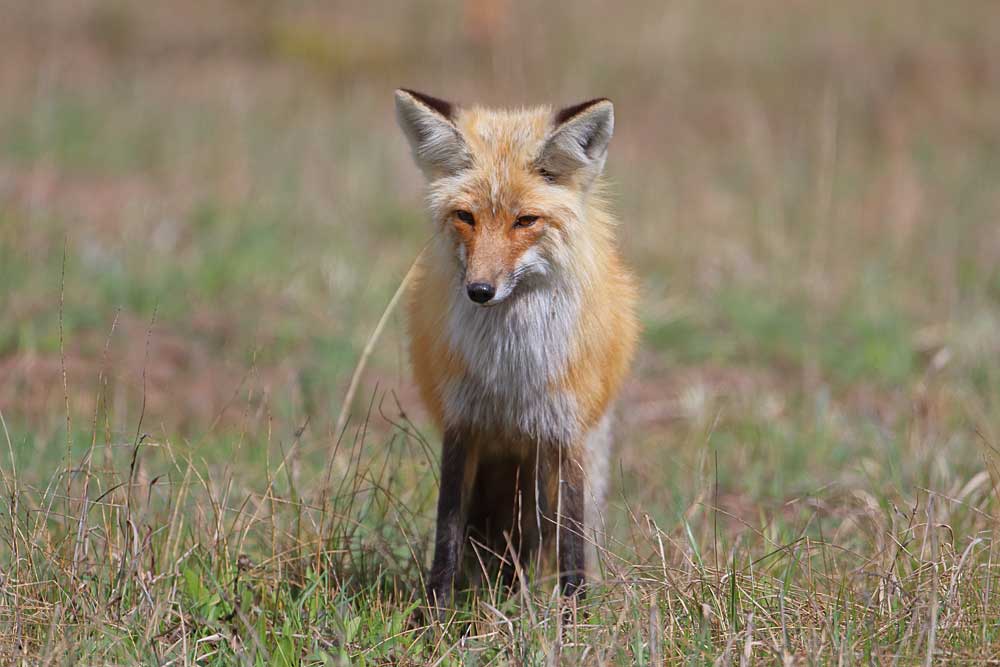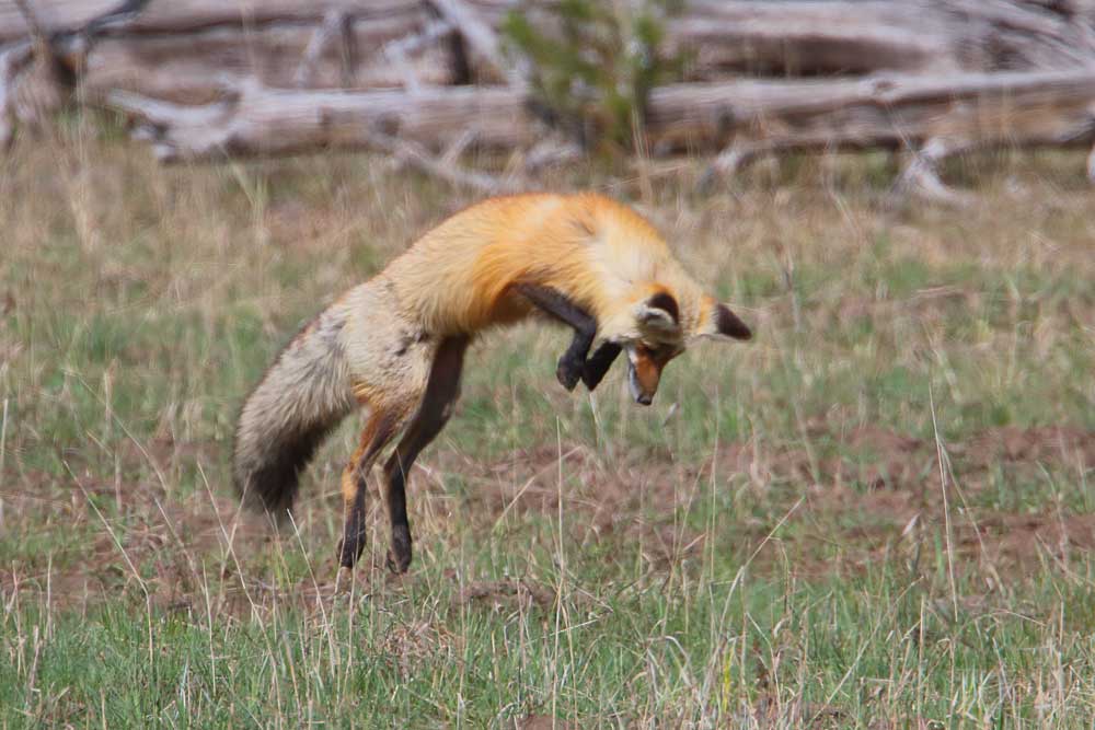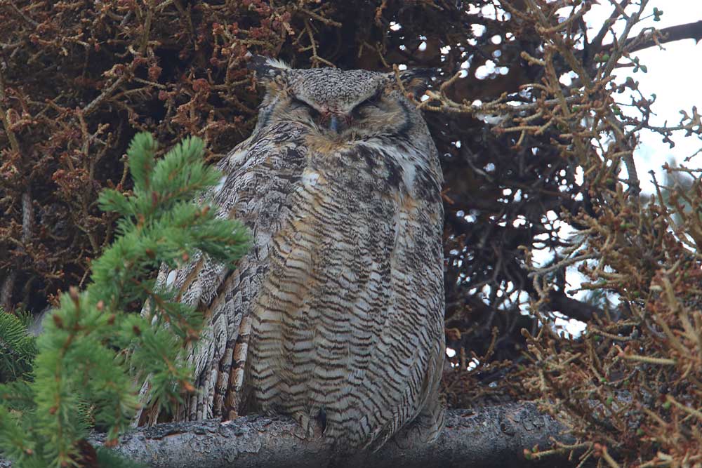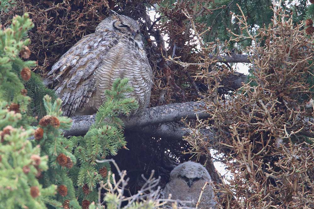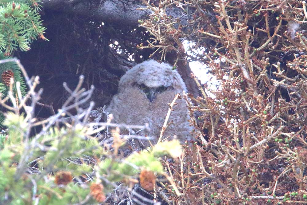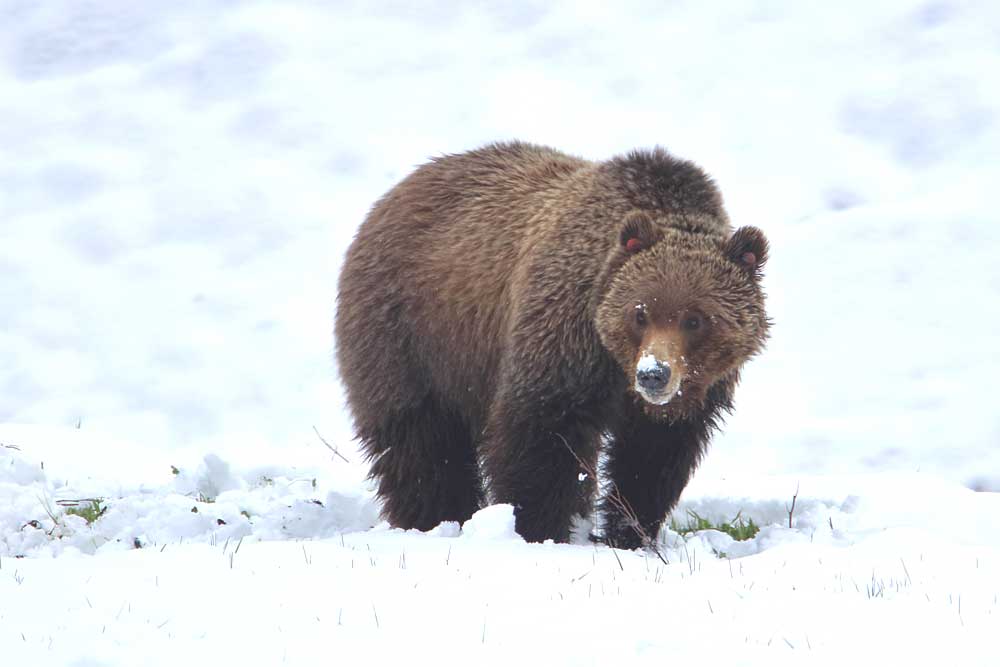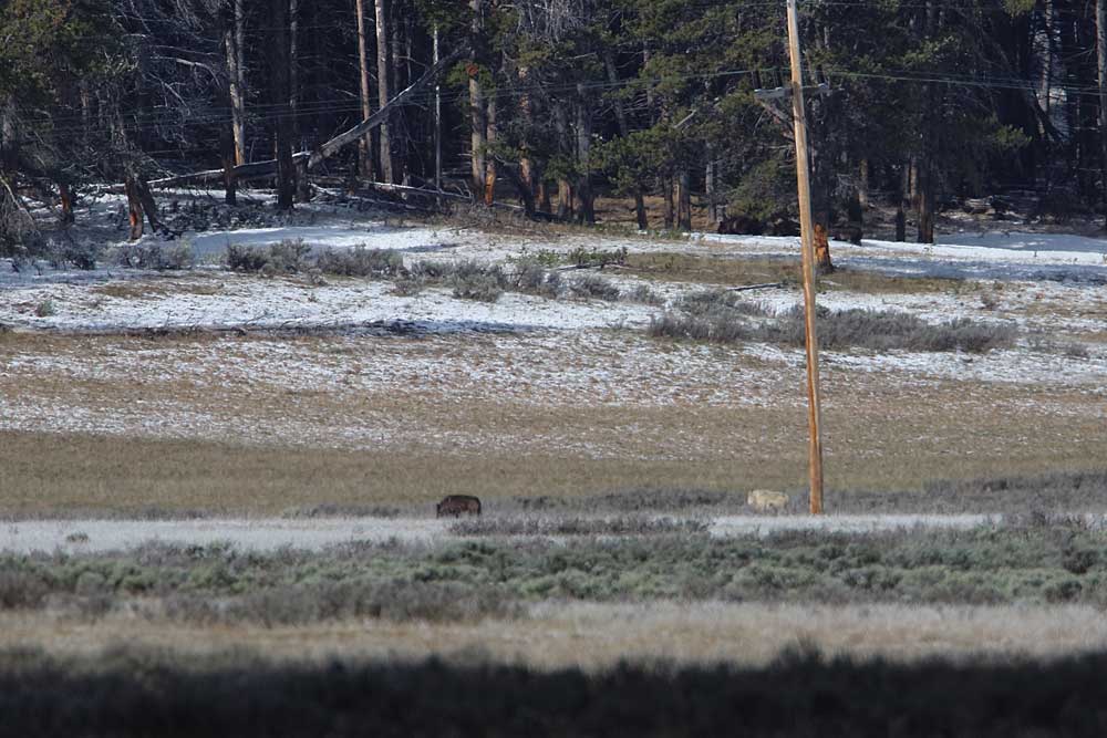 Canyon and Hayden Valley and Lake seemed like a different world.  Last night’s snowfall has transformed this part of the park into winter; trees and fields dusted with snow.  It was beautiful.  It snowed and rained throughout the day, the temperature not rising above 37º in the southern end of the Park.  Traveling from Hayden to Norris, we looked for the Obsidian bear as we turned north.  She has two two-year-old cubs.  We found the three bears at Obsidian Creek, the sow foraging with one cub; the other cub in the trees.  They all looked very healthy and ignored the crowd.  Continuing on to Mammoth, a beautiful fox was hunting near Indian Creek campsite.  The tips of its ears were black, and it had long black stockings.  Stunning.  We checked on the great horned owl nest near Albright Center and found an adult proudly perched on a branch above an owlet sitting in the nest.  The owlet was just a fuzzy mound of light gray feathers and appeared almost as large as its parent.