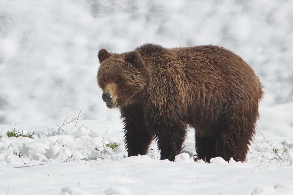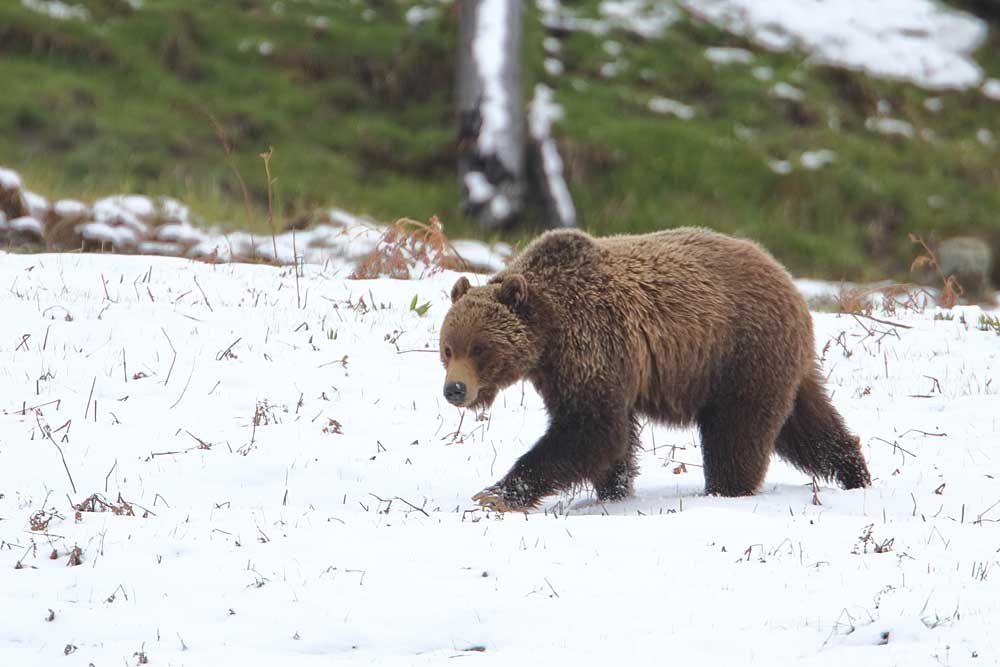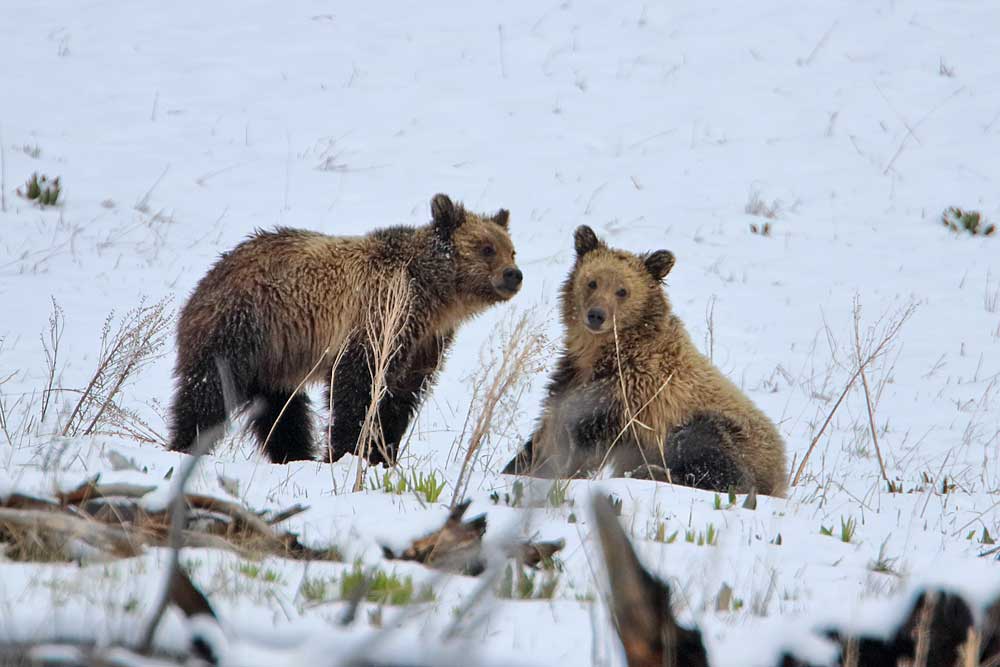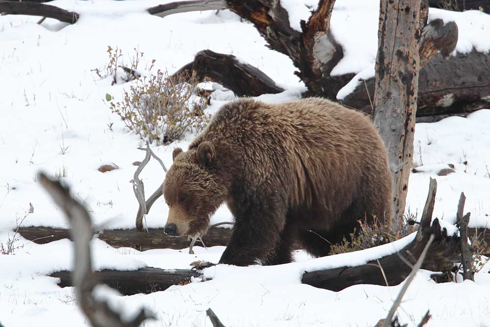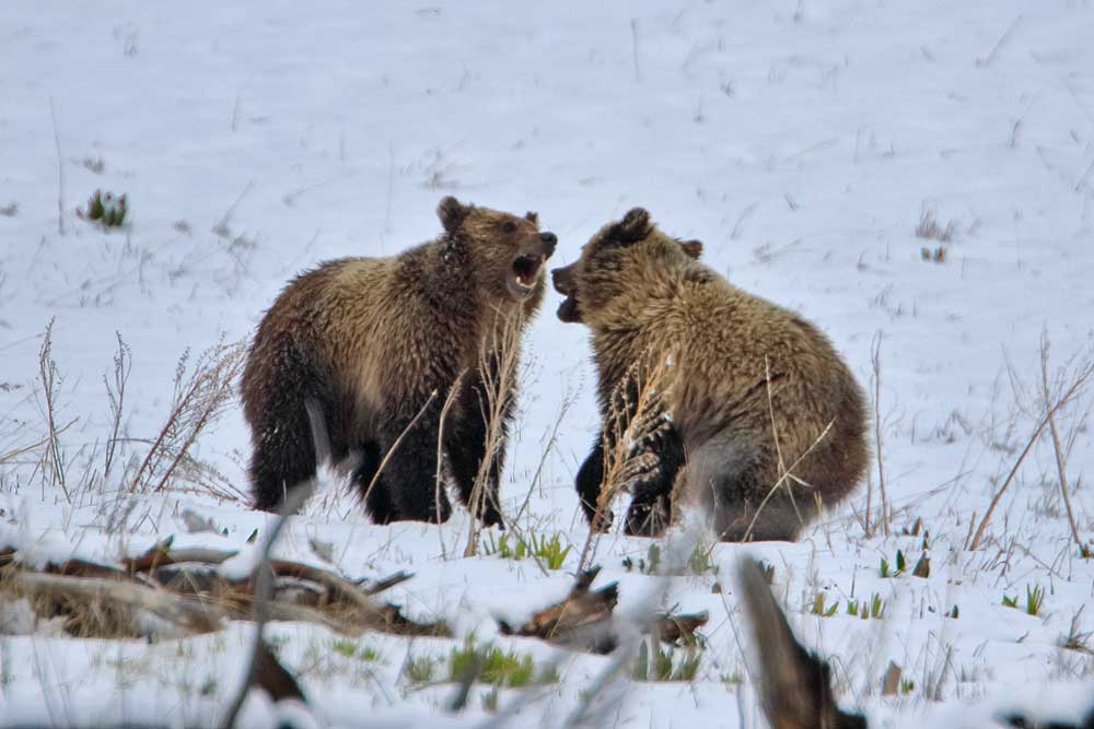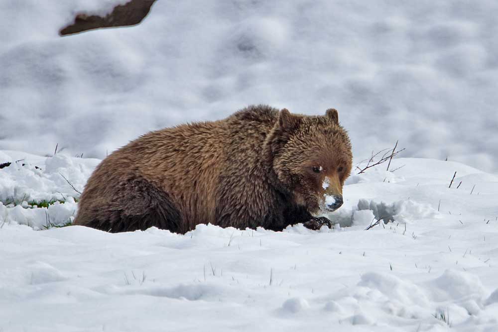 We headed south to Yellowstone Lake looking for bears.  When we reached Mary Bay, a grizzly boar was walking at the base of the hills behind bison grazing between thermals.  He was headed west, so we headed on to Mary Bay where a big boar grizzly was digging in the snow.  I later learned from a ranger this boar is Snow’s “boyfriend.  Snow and her cubs were on the hillside between Mary and Sedge Bays foraging in the grass between deadfall.  The cubs are 2-1/2 years old now and Snow has begun courting, so these youngsters may be on their own soon.  They were very entertaining, wrestling with each other as they played in the snow.