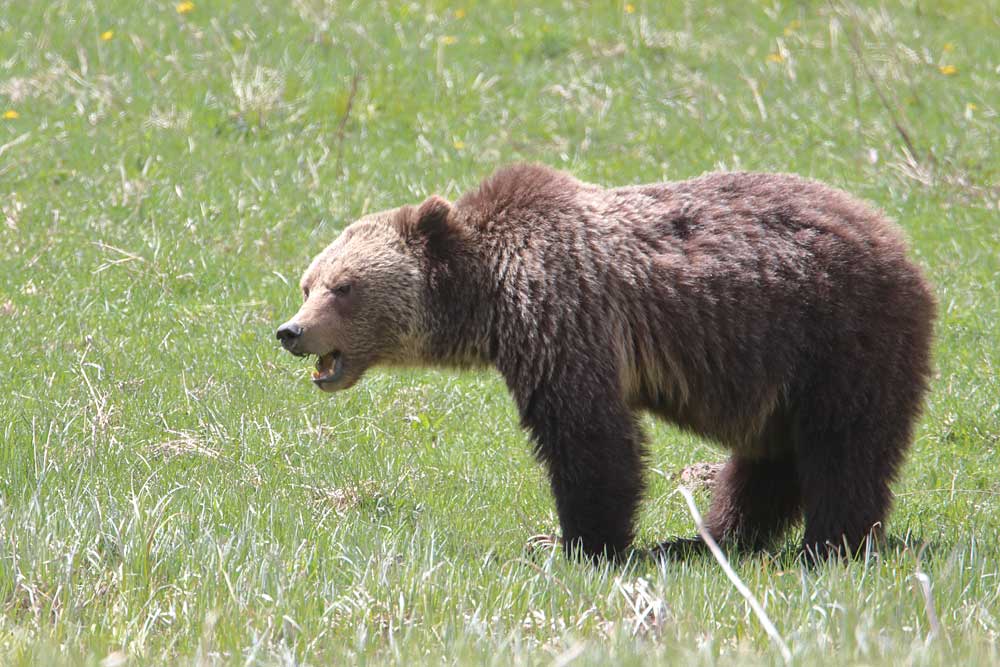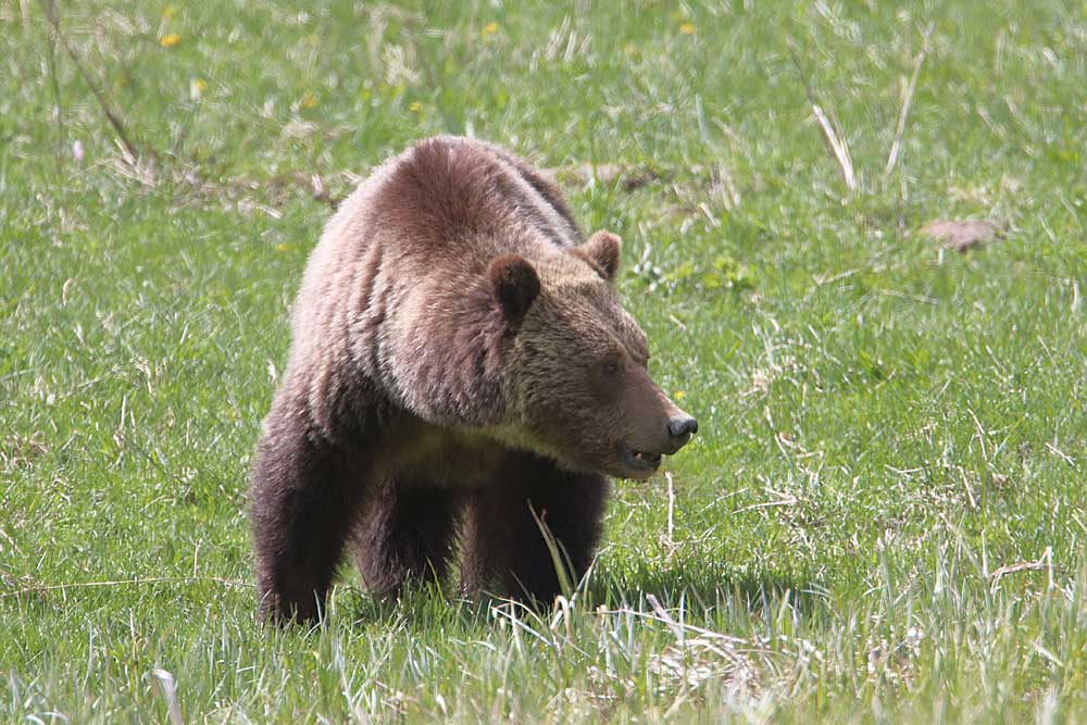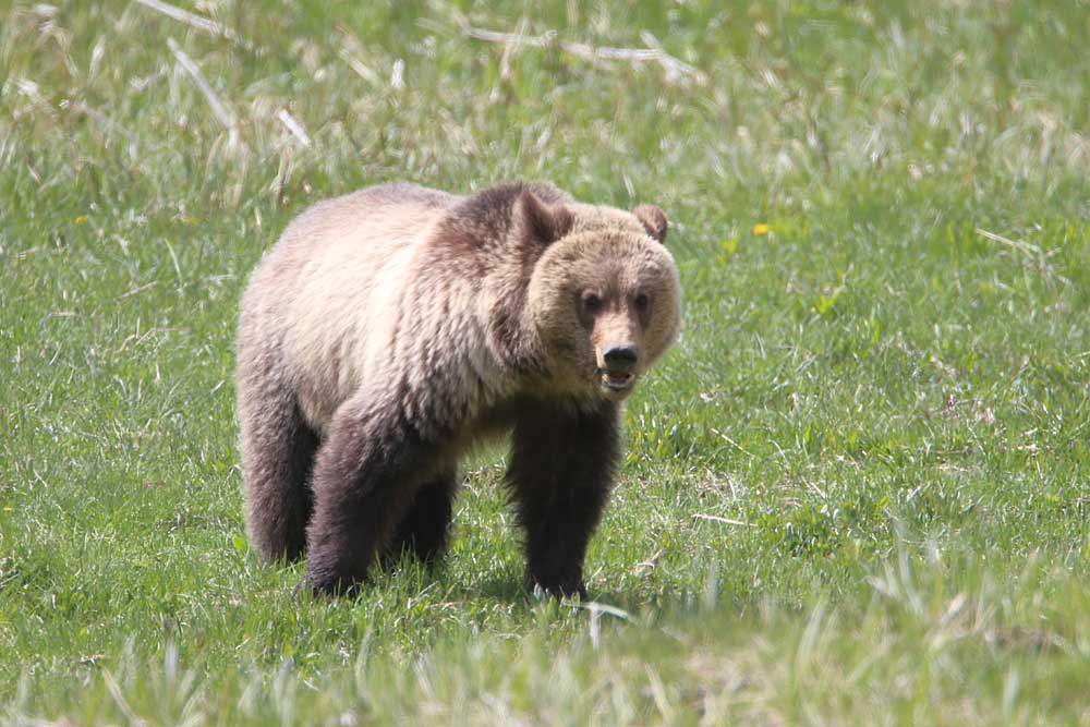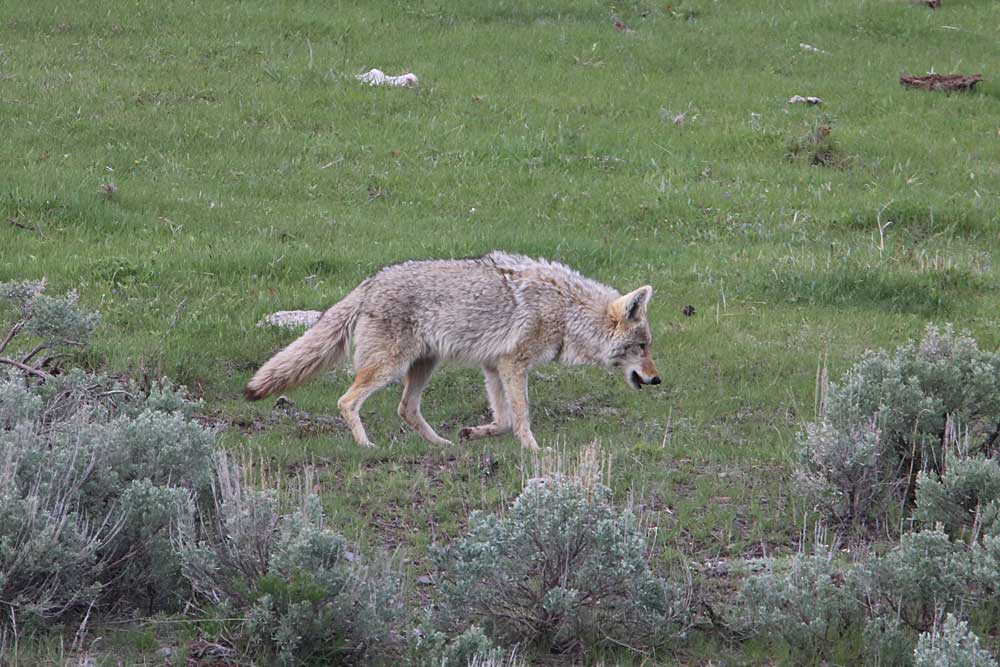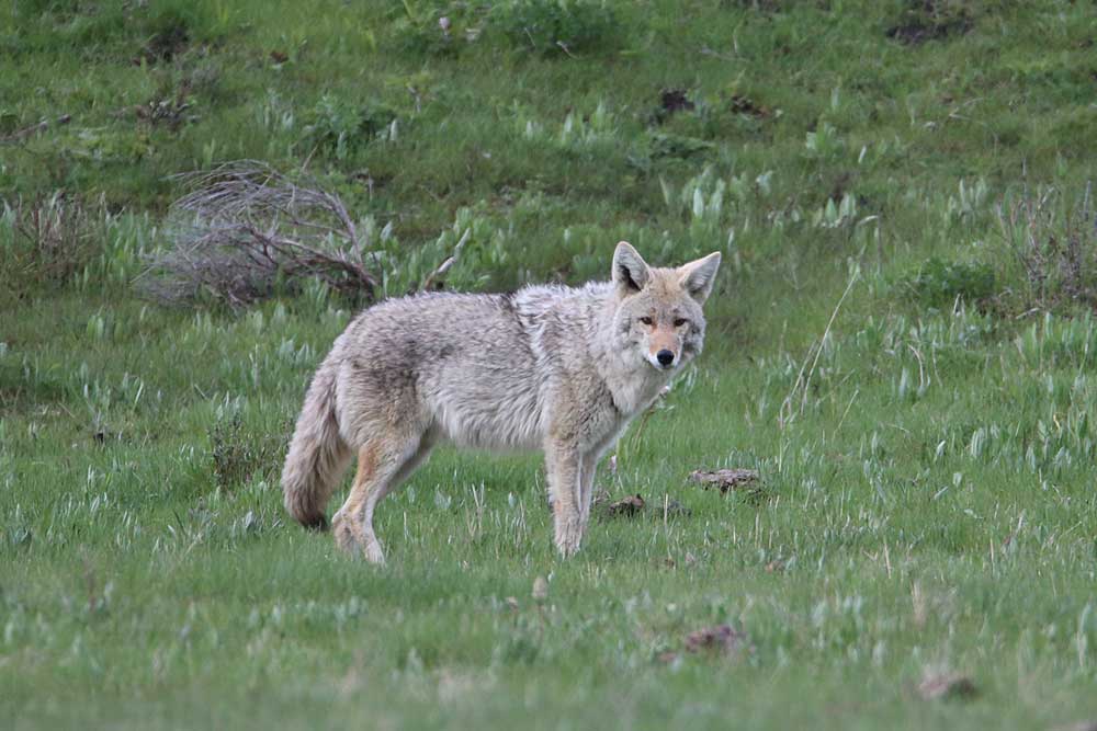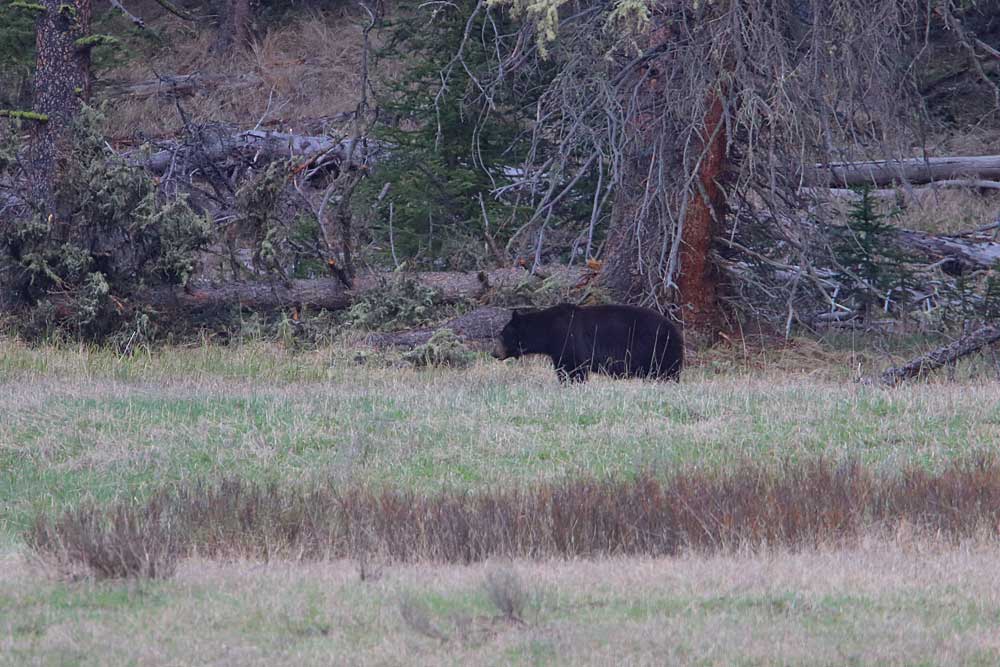 Driving through Little America, we checked on the Junction Butte den briefly where a black wolf adult came out of the den followed by five black pups.  Then we continued toward Silver Gate and stopped to take photos of “Tripod,” the coyote that limps.  He seems to be doing well and I heard he has his own family.  Passing Round Prairie, a moose grazed on the hillside and at Soda Butte picnic area, a black bear foraged on the slopes across the creek.  A full day, a good day, especially seeing the Wapitis.