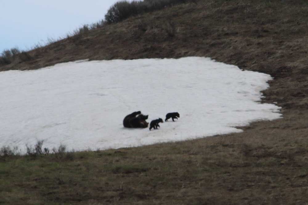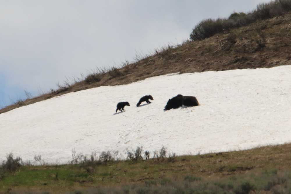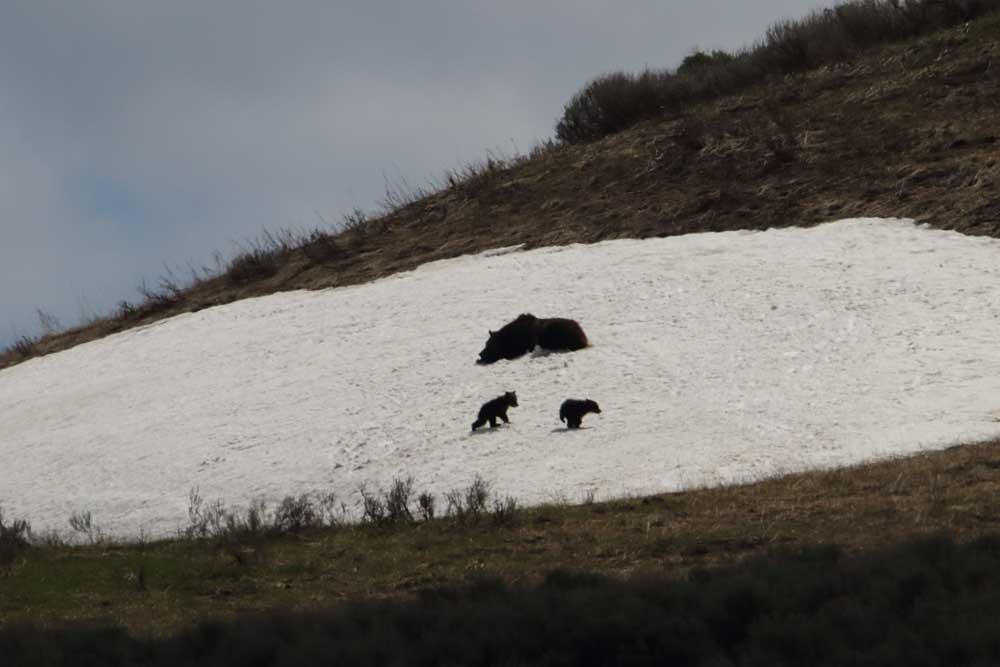After watching the wolves for a while, we headed down the road where a large crowd watched another grizzly sow and her two coy on a snow patch on the hills above the road. We didn’t stop, hoping to find bears at Mary and Sedge Bays. We were sadly disappointed; on this beautiful day there were no bears near Lake Yellowstone. The weather is warmer now, and that may have something to do with it. We drove as far as Gulf Point and Bridge Bay and turned around. The grizzly and her two coy were still out playing together on a snow patch. The cubs wrestled each other and slid down the snow bank. They chased each other while their mother rolled on her back in the snow, her feet in the air. The bears were having so much fun and it was so entertaining, we could have watched for hours.