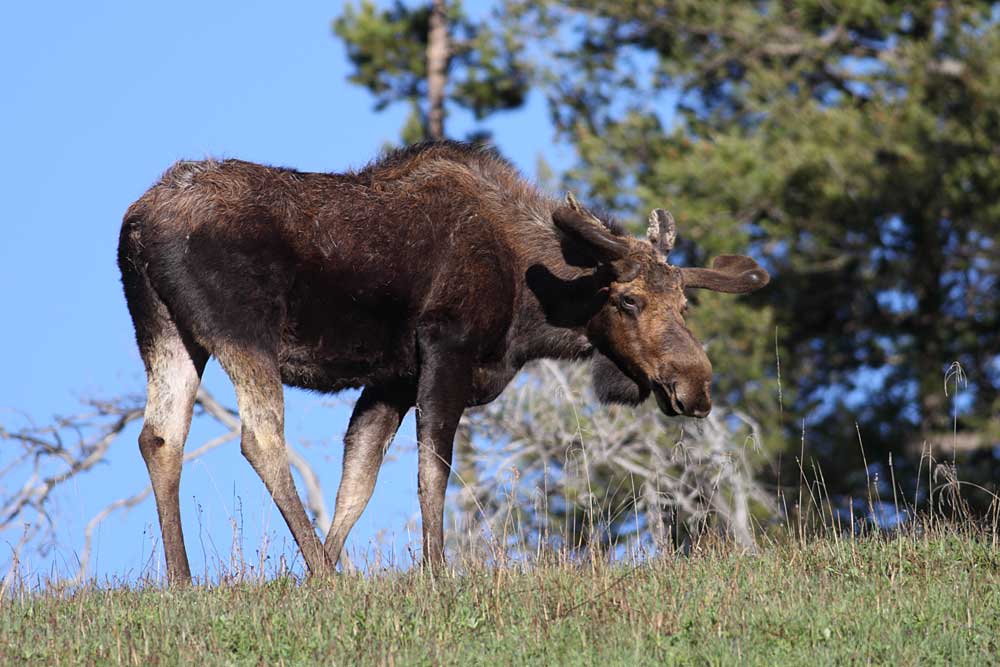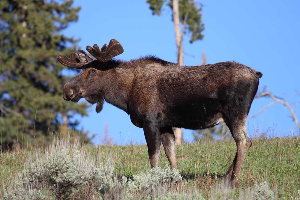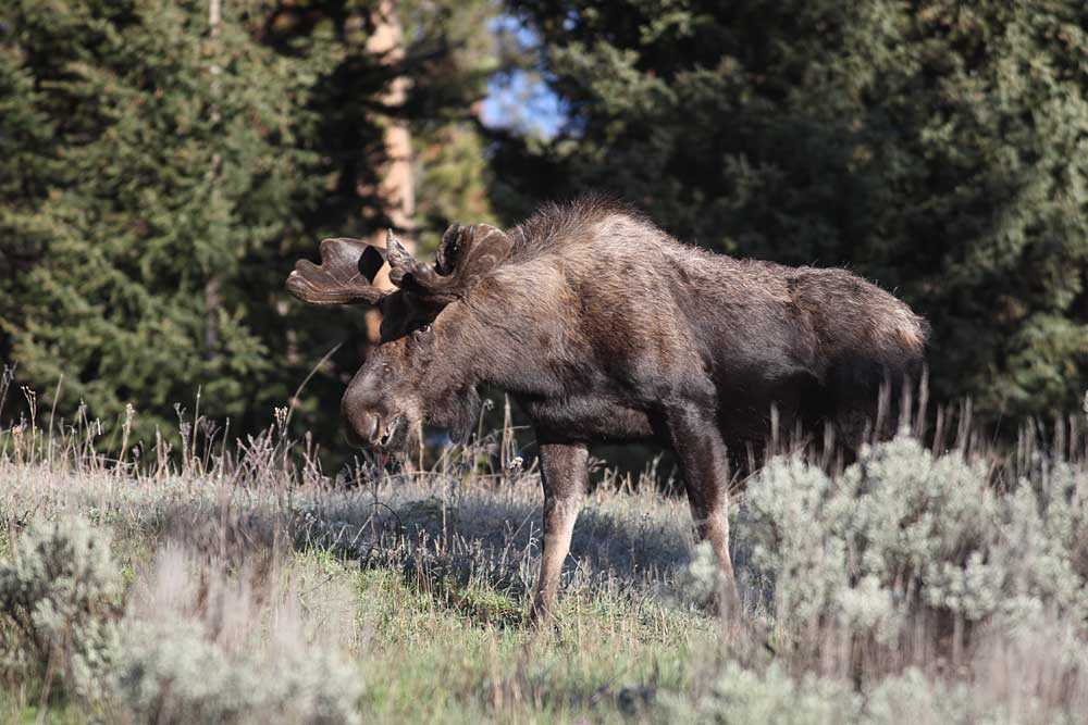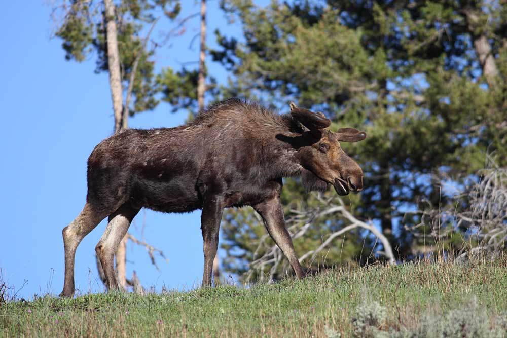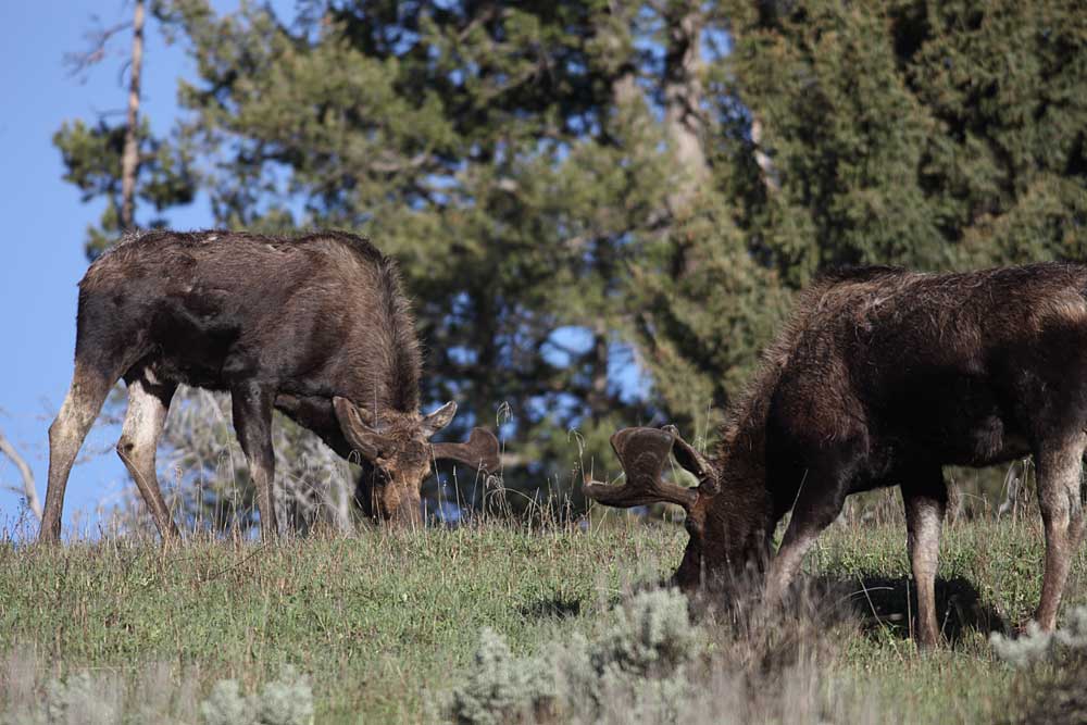 We headed south today, but not before passing the four young bull moose grazing on the hills above Round Prairie. Lamar Valley was quiet aside from people viewing a grizzly sow with two coy on the slopes above Amethyst Bench. Even in the scope the bears were tiny, but it was obvious the sow was nursing her cubs. We expected the Junction Butte adults would be in view as they made their way back to the den, but we never saw them and didn’t hear anything on the radio. Slough Creek Road was jammed with vehicles; people wanting to see the puppies. We drove down to the gravel parking lot, setting up the scope just in time to see a black wolf walking from the western trees toward the den opening followed by five puppies. There may have been more puppies, but five is what we counted. The puppies are quite active now, exploring the grass and sage around the den. When the puppies disappeared from view, and 1479F went into the den, we continued south.